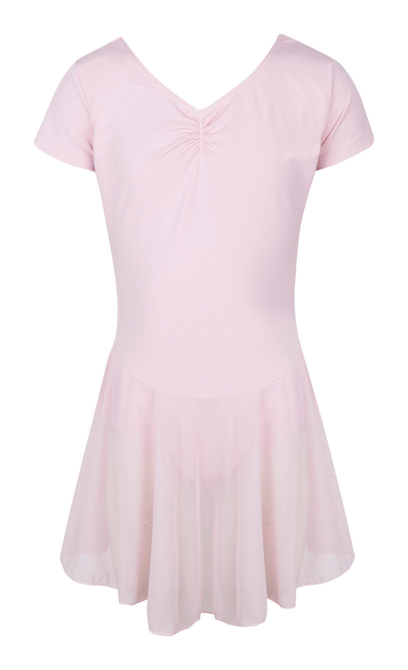 Fully lined, capped sleeve leotard with attached mesh skirt and front ruche detailing.